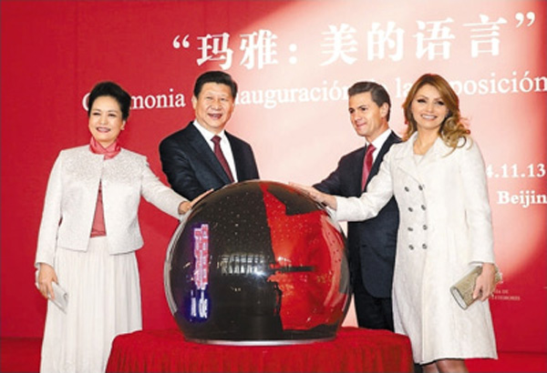 【原音再现】:中墨都拥有悠久历史和灿烂文化,共同为人类文明进步作出了不可磨灭的贡献。去年我访问墨西哥期间,参观了奇琴伊察玛雅古迹,给我留下深刻印象。培尼亚总统这次访华期间,双方共同举办玛雅文化展,是两国文化交流的盛事。通过举办文化展等活动,让收藏在博物馆里的文物、陈列在广阔大地上的遗产、书写在古籍里的文字都活起来,使两国人民跨越时空、超越国界,感受对方国家的精彩文明,使两国人民源远流长的友谊焕发出新的生机和活力。中方愿同墨方一道,促进文明互容、互鉴、互通,为人类文明进步作出新的贡献。