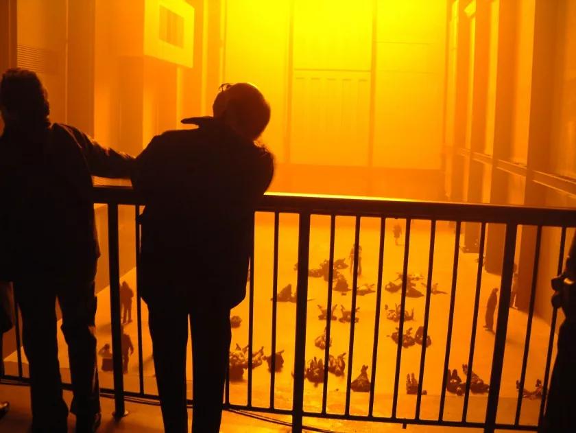 在“The Weather Project”中,糖和水的混合物通过加湿器在空气中形成细雾,大厅的天花板上覆盖着一面巨大的镜子,由数百个单色灯组成的半圆形圆盘在镜子的反射下像一个巨大的橙色太阳。许多参观者躺在地上,挥舞着他们的手和腿,从上往下看,就像在光芒下扭动的黑色阴影,奥拉维尔想让参观者去想象“一个不热的太阳和一个看得到边际的天空”。
