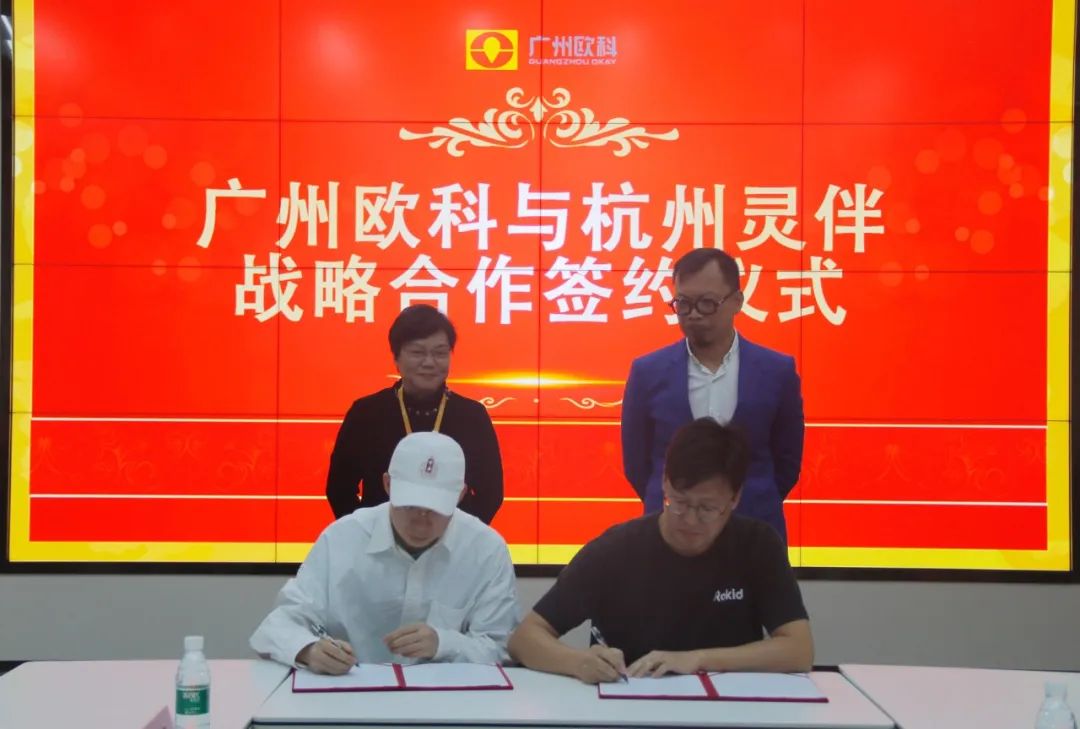 广州欧科总经理助理王梓雄先生与杭州灵伴副总裁张华云先生分别代表双方企业进行签字