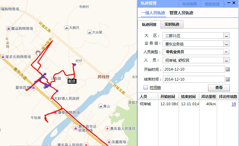 回放在工作时段内,业务员的行动路线,发现问题,及时纠正。