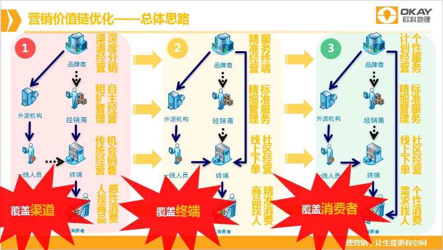 欧科易卖(OKay EM)是广州市欧科地理信息技术服务有限公司(http://www.okaygis.com/)以优化快消品行业营销价值链为目标,在发挥自身GIS领域积累的资质、技术、数据优势的基础上,整合移动互联技术,在商业地理领域的创新产品之一。优化过程共分两个阶段: