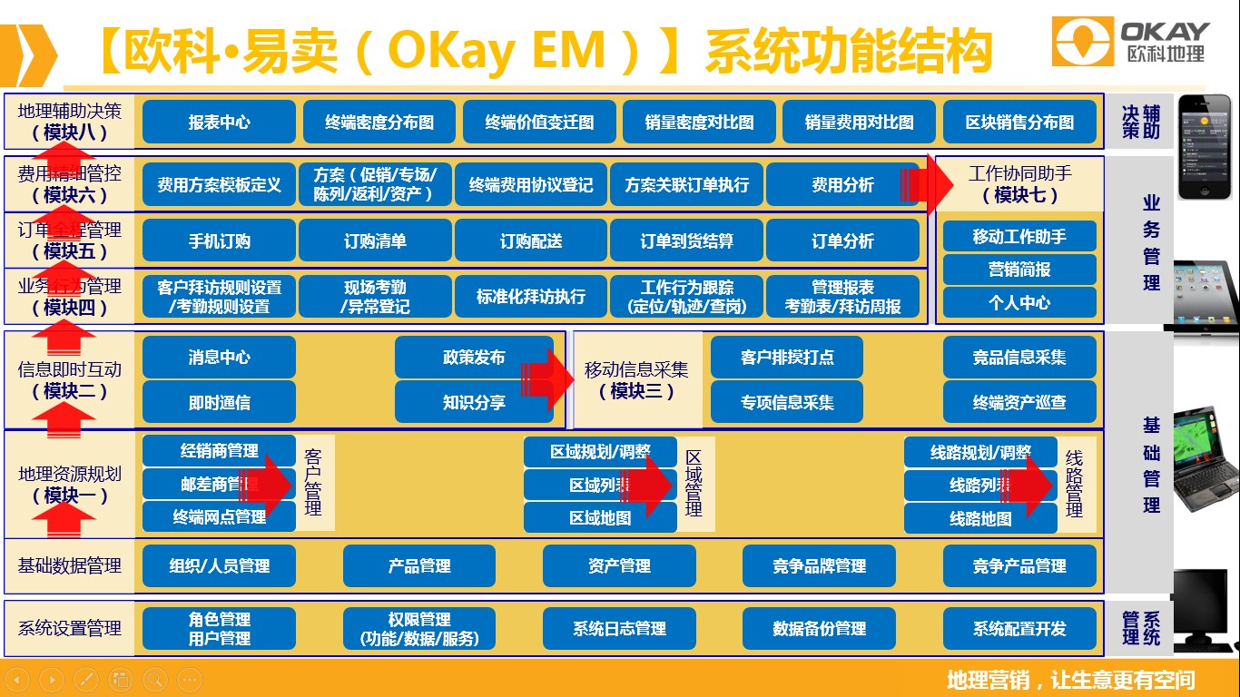 专注于帮助消费品经营企业优化、升级和创新营销体系,帮助客户成为行业龙头。欧科易卖(OKay EM)系统功能结构如下图: