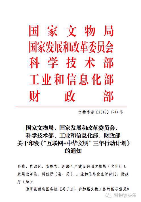 12月6日,国家文物局官方网站发布了由国家文物局、国家发展和改革委员会、科学技术部、工业和信息化部、财政部共同编制的《“互联网+中华文明”三年行动计划》(以下简称“计划”)。《计划》提出“互联网+中华文明”三年发展目标和推进文物信息资源开放共享、调动文物博物馆单位用活文物资源的积极性、激发企业创新主体活力、完善业态发展支撑体系四大主要任务。