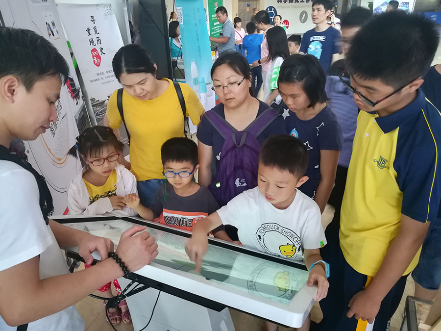 在开幕式上,广州欧科董事长熊爱武分享了恐龙复原模型——皖南龙的文创故事,阐述欧科“智慧+文化”的科技创新与文化创意深度融合的理念。 熊爱武董事长发表演讲,诠释“智慧+文化”理念 全景智能导览,“刷屏”多角度观赏精美工艺 现场观众“刷屏”体验全景导览系统 观众观摩“如初三维重建平台”,体验自主三维建模效果