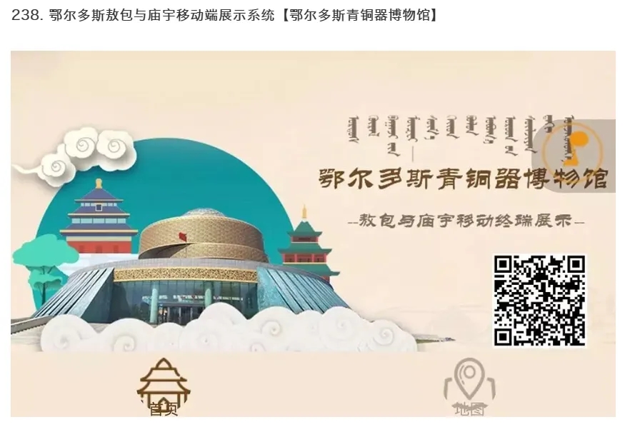 为便于公众查询浏览,国家文物局对全国各地制作的网上博物馆展览进行了优选汇总,并分批在文化和旅游部和国家文物局网站公布相关链接,现已发布六批已整理链接。在推荐展出中,鄂尔多斯青铜器博物馆制作并选送全景展厅“鄂尔多斯青铜器博物馆”和“鄂尔多斯敖包与庙宇”移动端展示分别入选国家文物局推送第三批、第五批全国博物馆网上展览资源推荐,向全国观众展示了鄂尔多斯厚重的历史文化。