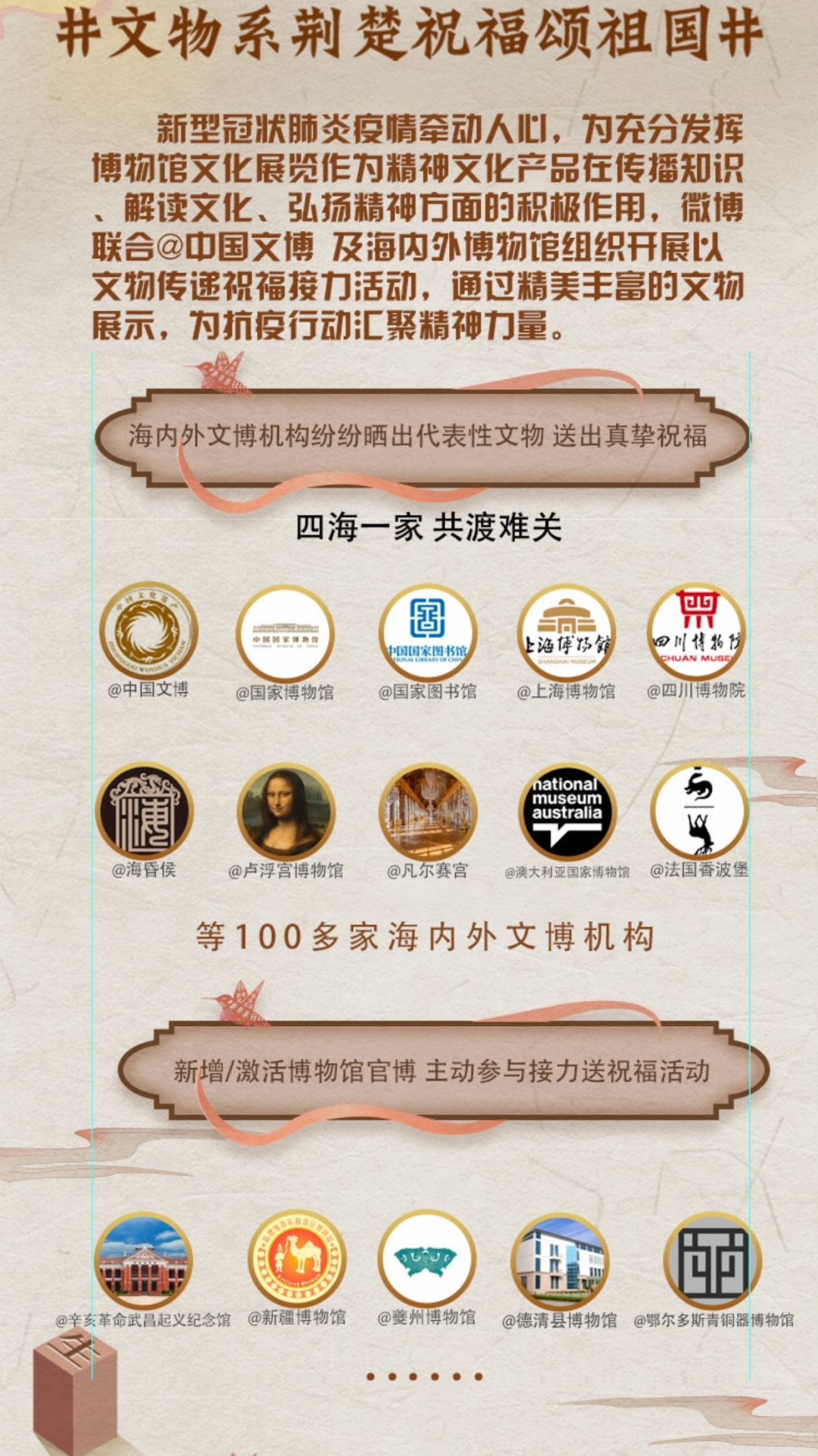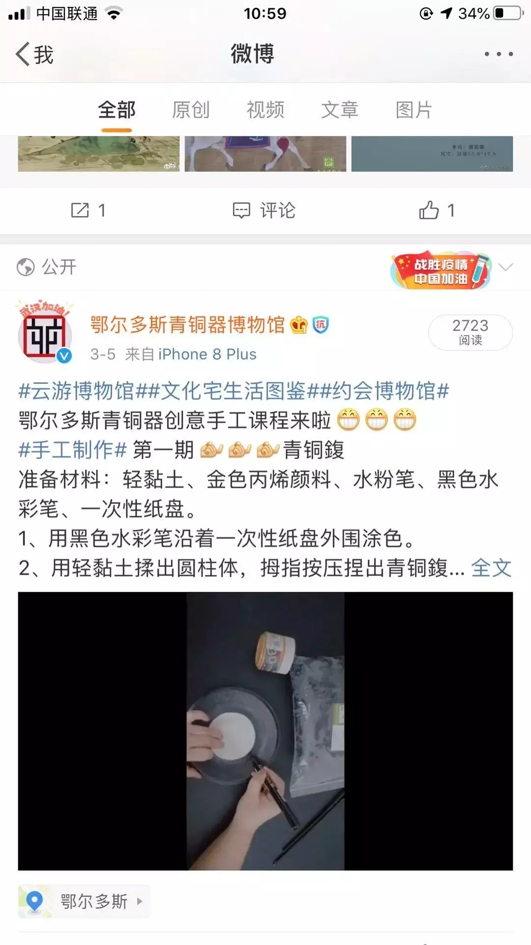 参加了“中国文博”组织开展以文物传递祝福接力的全国线上活动,通过精美、丰富的文物展示,成为特殊时期打赢攻坚战的重要精神力量。鄂尔多斯青铜器博物馆在2020年2月19日、2月29日和3月9日,圆满完成“文物系荆楚祝福颂祖国”的三轮接力,成功把祝福送到武汉。活动获得文旅中国 、中国旅游报 、凤凰网 、宁夏日报 等多家媒体报道关注,海内外共上百家博物馆官方微博参与,话题阅读量1.4亿+(热度持续上升,活动仍在延续);另外还有文博头条、新浪旅游、超话社区三方联合国家文物局官方微博@中国文博,联动全国各地博物馆共同发起#云游博物馆#系列活动,主推博物馆线上数字化展示,为微博用户提供一种足不出户习得知识、游览全国博物馆的活动:【文物知多少】、【低配电影海报】、【短视频线上文物讲解】(筹备中)、【云游博物馆】、【云游公开课】(筹备中)、【各大节气海报宣传】等,目前后台统计数据官方微博阅读量自开通20多天以来阅读量共计928万,鄂尔多斯青铜器博物馆超话阅读量910.3万,共计阅读量1838.3万,阅读量持续上升中。